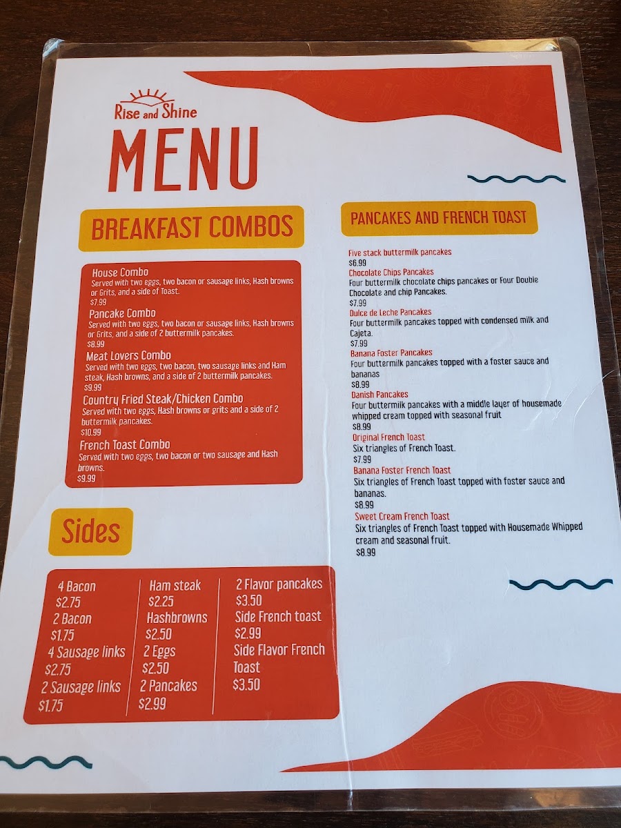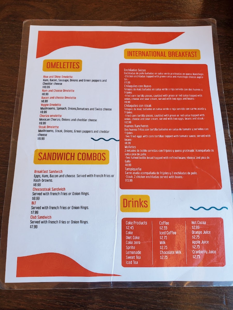 Mexico omelette filled with cheese, bell peppers, onions, and diced tomatoes. Choose from pancakes, potatoes, grits (plain or with cheese), or bread (wheat or white) as a side.